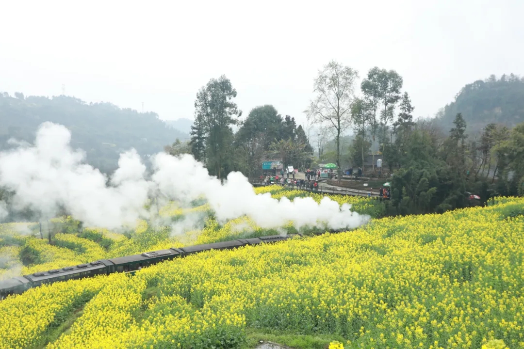 嘉阳小火车的铁轨蜿蜒向远方,油菜花簇拥着铁轨绽放,春意在工业遗迹的温柔蔓延。